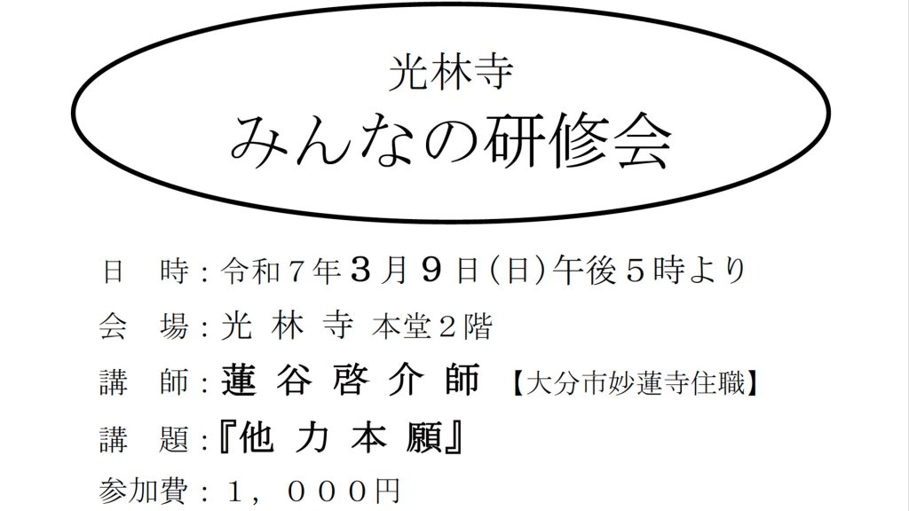 令和7年3月9日(日) 17:00より、「みんなの研修会」を開催いたします。 講師は、蓮谷啓介師(大分市妙蓮寺住職)です。 詳細は、下記のイベントページをご覧ください。 多くのご参加お待ちしております。