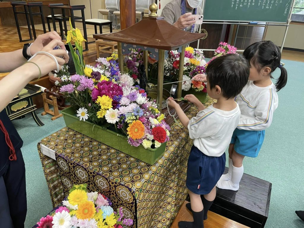5月19日(金)に「たかすこども園」と「くすのきこども園」両園の4、5歳の園児が、5月20日(土)には「児童養護施設 鷹巣学園」の児童が、お釈迦さま花まつり・親鸞さま降誕会に参拝しました。
